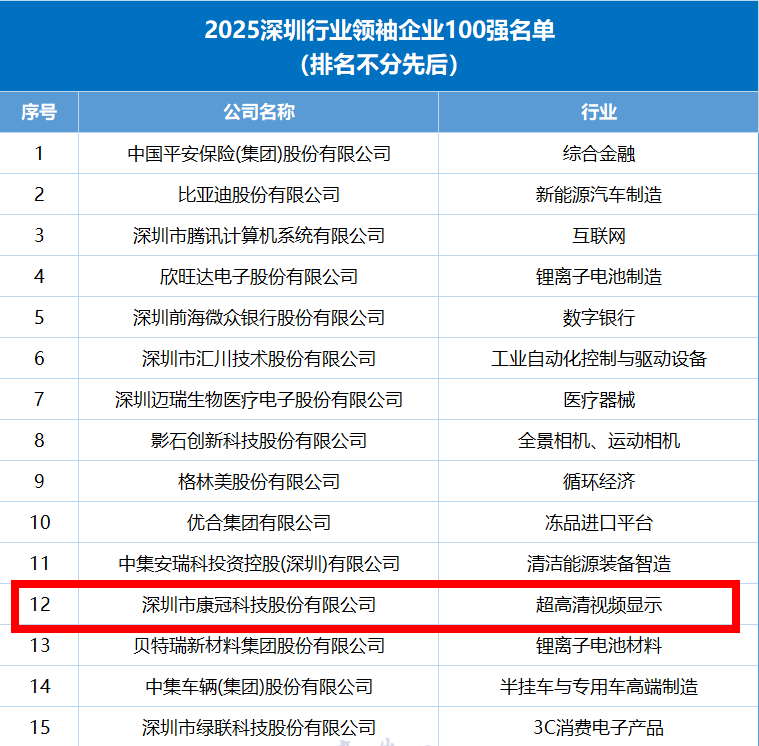 近期,由深圳市工商业联合会(总商会)、深圳报业集团指导,深圳市行业领袖企业开展促进会与深圳商报/读创客户端共同主办的“2025深圳行业领袖企业100强”评选结果出炉。K8凯发国际科技成功入选该榜单,彰显了公司在超高清视频显示领域的强劲实力,凸显了创新成果所带来的行业引领效应。